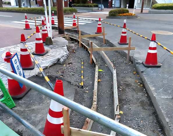 工事中は通行する方の安全を第一に考え、必要な範囲で交通規制を行い、迂回路や歩行者の通路を確保します。関係機関と連携しながら、工程の見通しを立てて施工します。